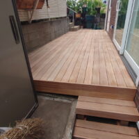 2台のトレーラーハウスの間にウッドデッキとステップを製作